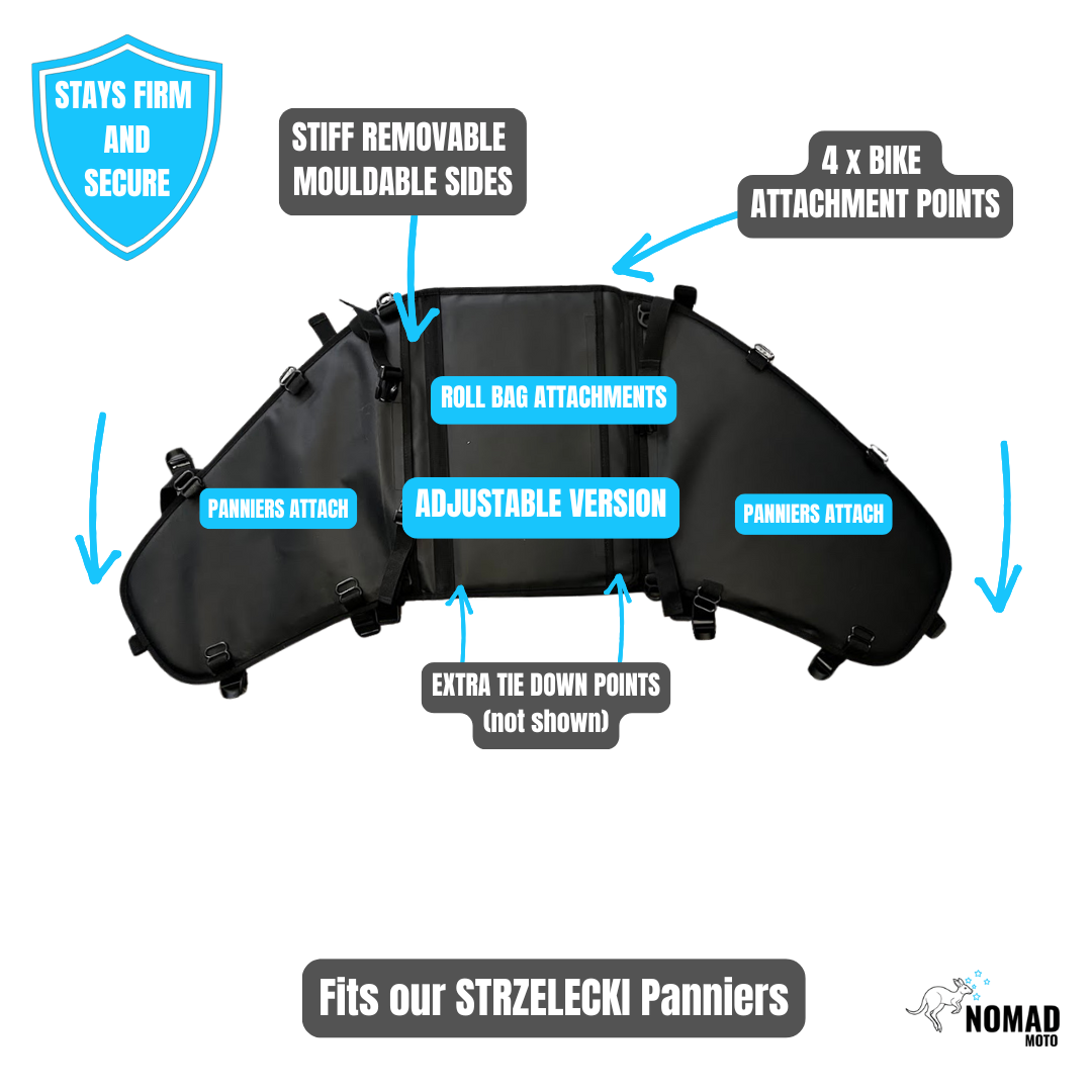 Die Strzelecki Rackless Base von NOMAD MOTO verändert die Gepäcklösung für Abenteuerfahrer grundlegend und bietet Vielseitigkeit, Komfort und unübertroffene Haltbarkeit ohne die Notwendigkeit schwerer, fester Gepäckträger.